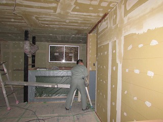 大工さんがプラスターボードを貼り仕上げにクロス・塗り壁・塗装壁等を